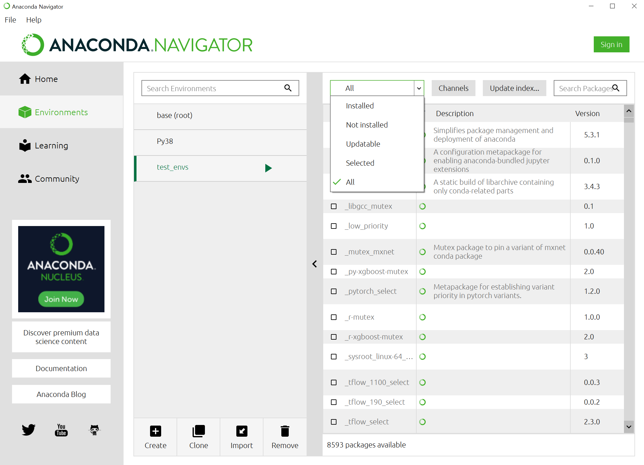 test_envs라는 환경이 추가된 것을 확인할 수 있다. 그리고 우측에서 이 환경의 패키지들을 관리 할 수있다. 우측 상단에 Select Box를 클릭하면 정렬하여 확인이 가능하다. 설치되지 않은 패키지를 검색을 통해 찾고 설치까지 할 수 있다.