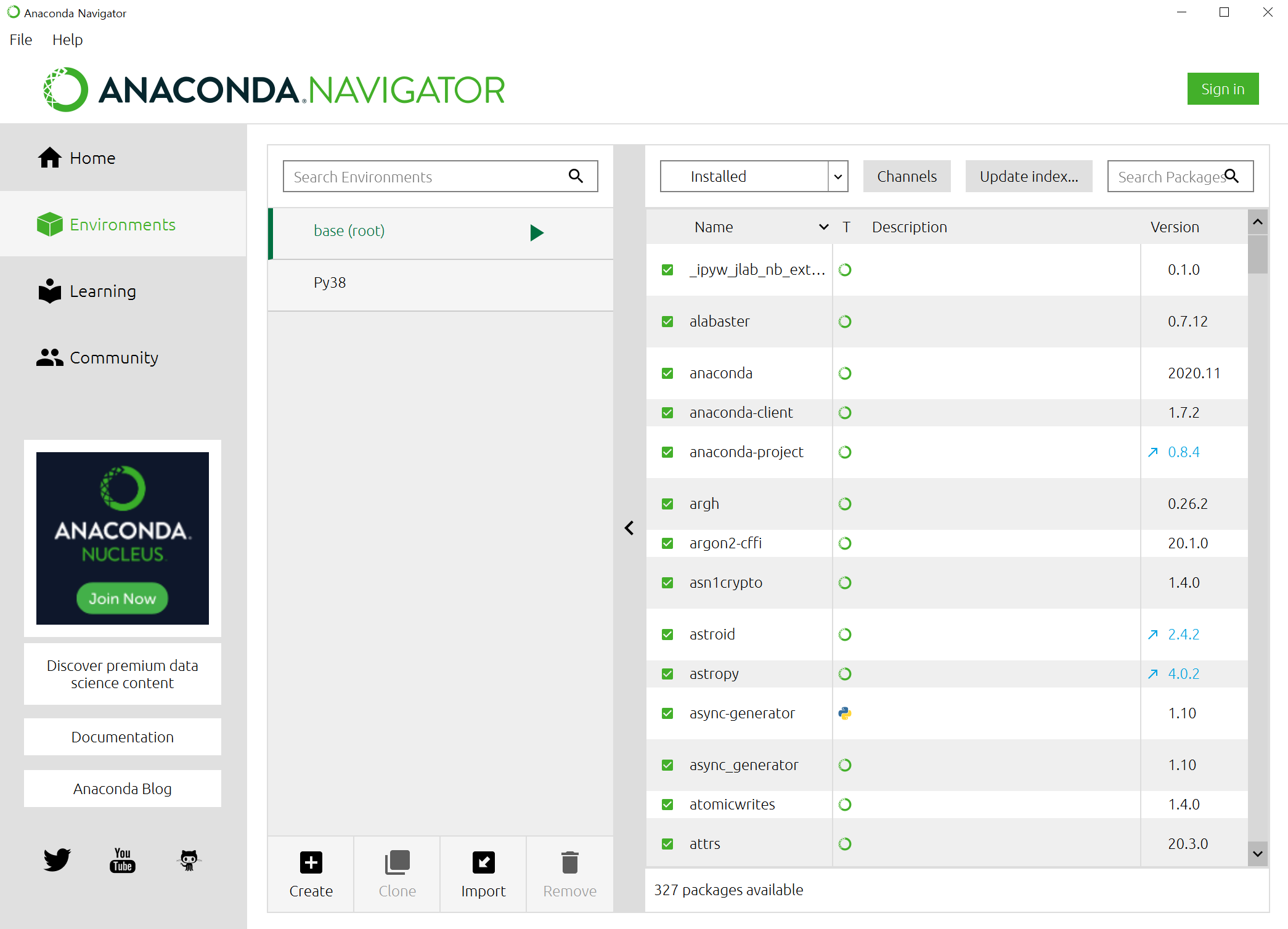 아나콘다를 설치하면 기본적으로 base(root) 환경이 설치되어 있다.