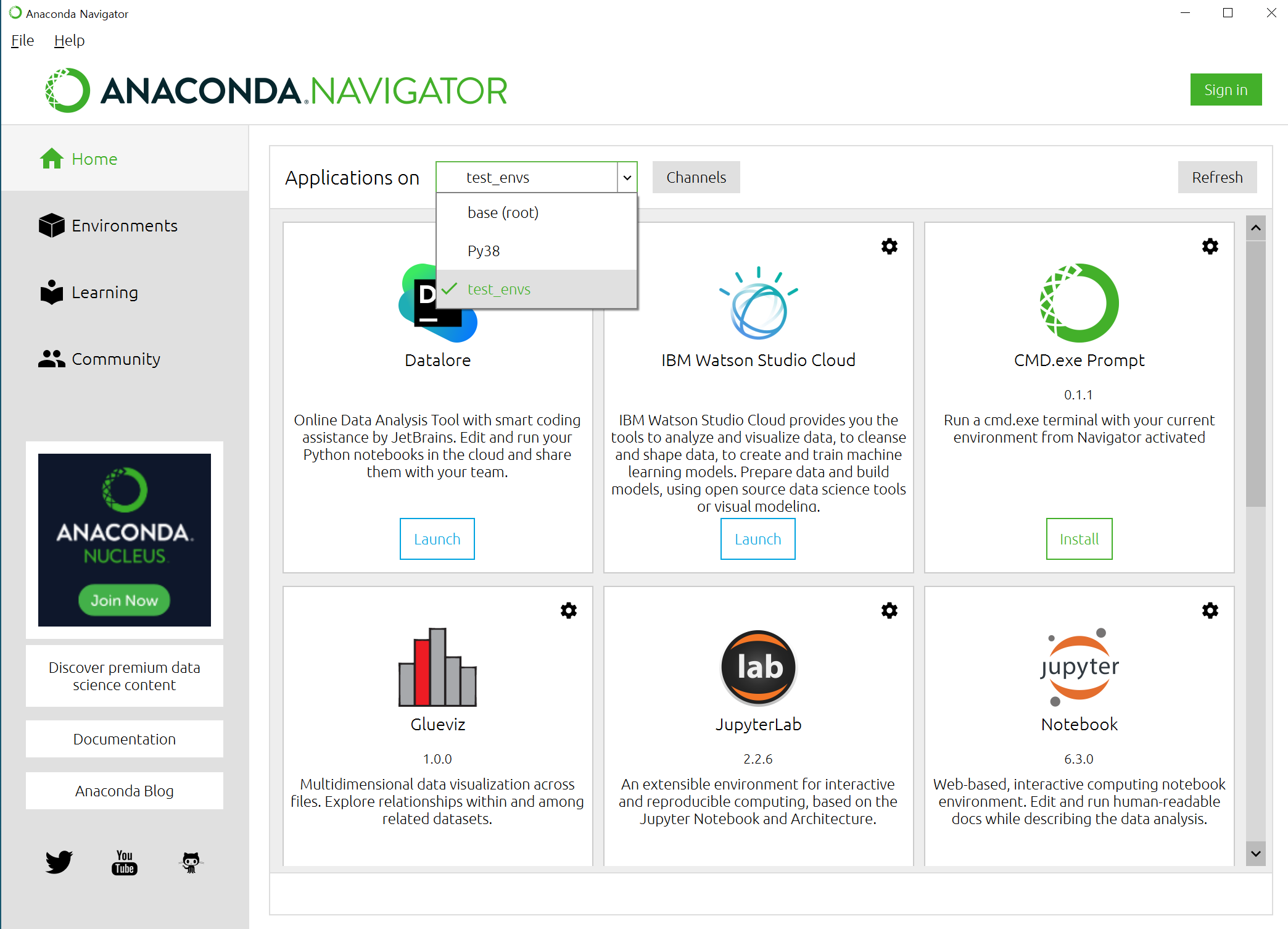 해당 환경(test_envs)에 스파이더를 인스톨(Intall)하여, 실행(Launch)하였다.