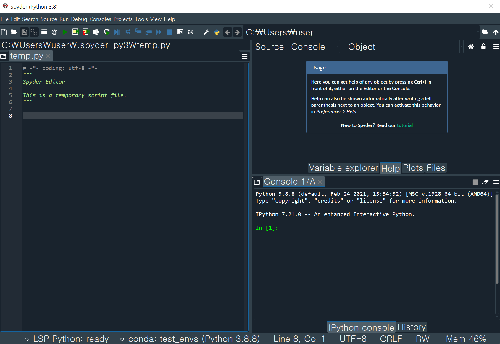 원하는 환경인 test_envs 로 선택 후 실행하였으니, 하단에 conda: test_envs (Python 3.8.8) 이라고 출력되는 것을 확인할 수 있다.