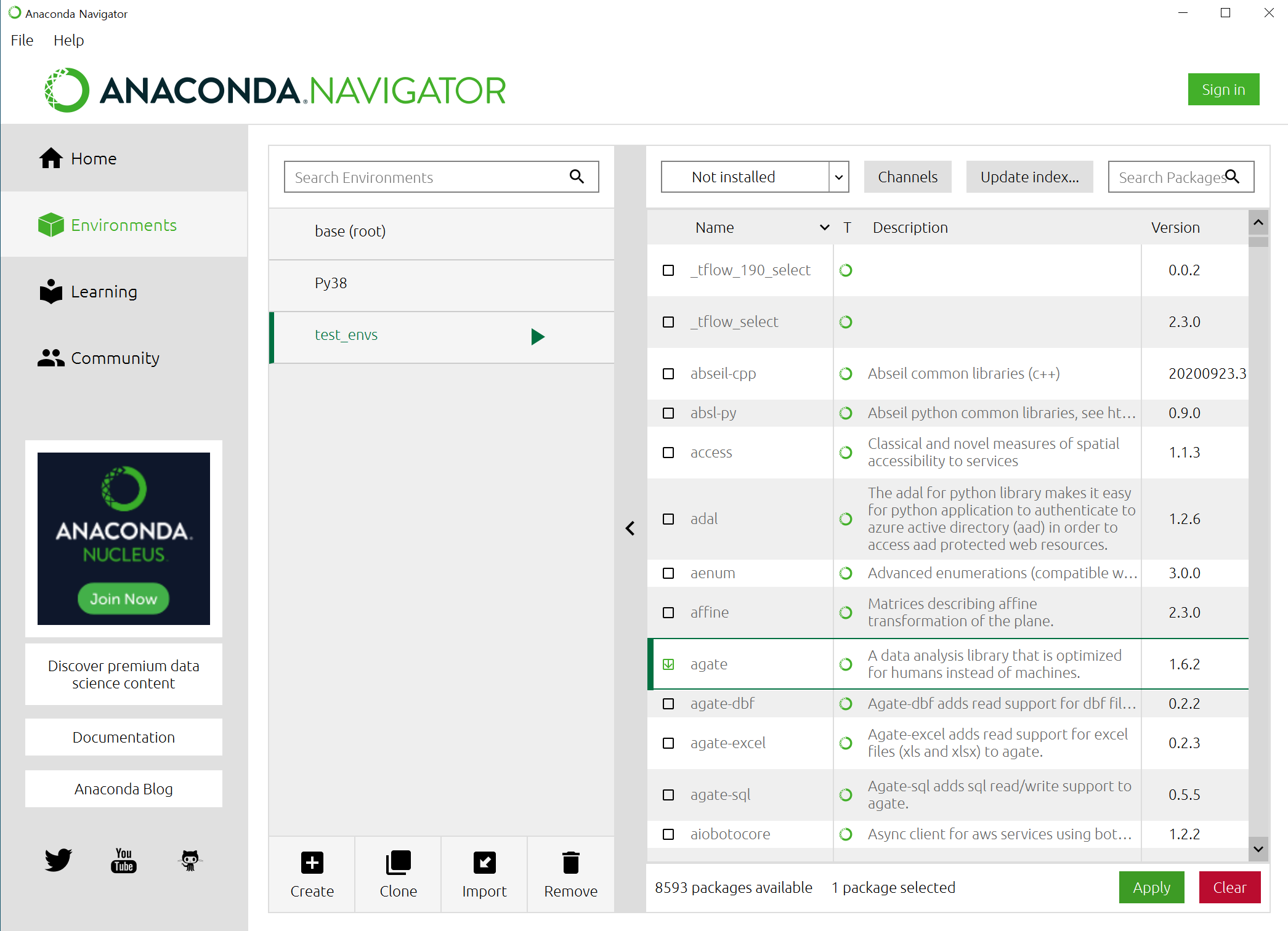 test_envs라는 환경이 추가된 것을 확인할 수 있다. 그리고 우측에서 이 환경의 패키지들을 관리 할 수있다. 우측 상단에 Select Box를 클릭하면 정렬하여 확인이 가능하다. 설치되지 않은 패키지를 검색을 통해 찾고 설치까지 할 수 있다.