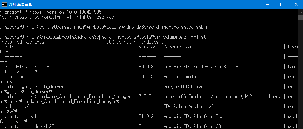sdkmanager는 아래와 같은 루트 bin 폴더에 위치하고 있어 cmd를 통해 해당위치까지 접근한다.
