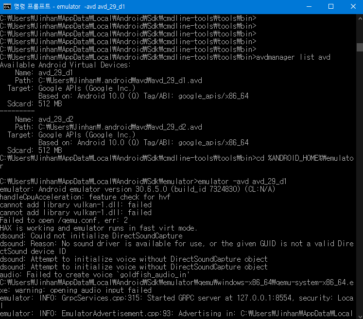 이동한 후 emulator -avd 디바이스 이름을 입력해보자