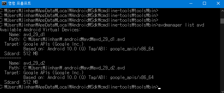 13. avd가 잘 만들어졌는지 확인해보자. 다음은 avd 목록을 확인하는 명령어다.