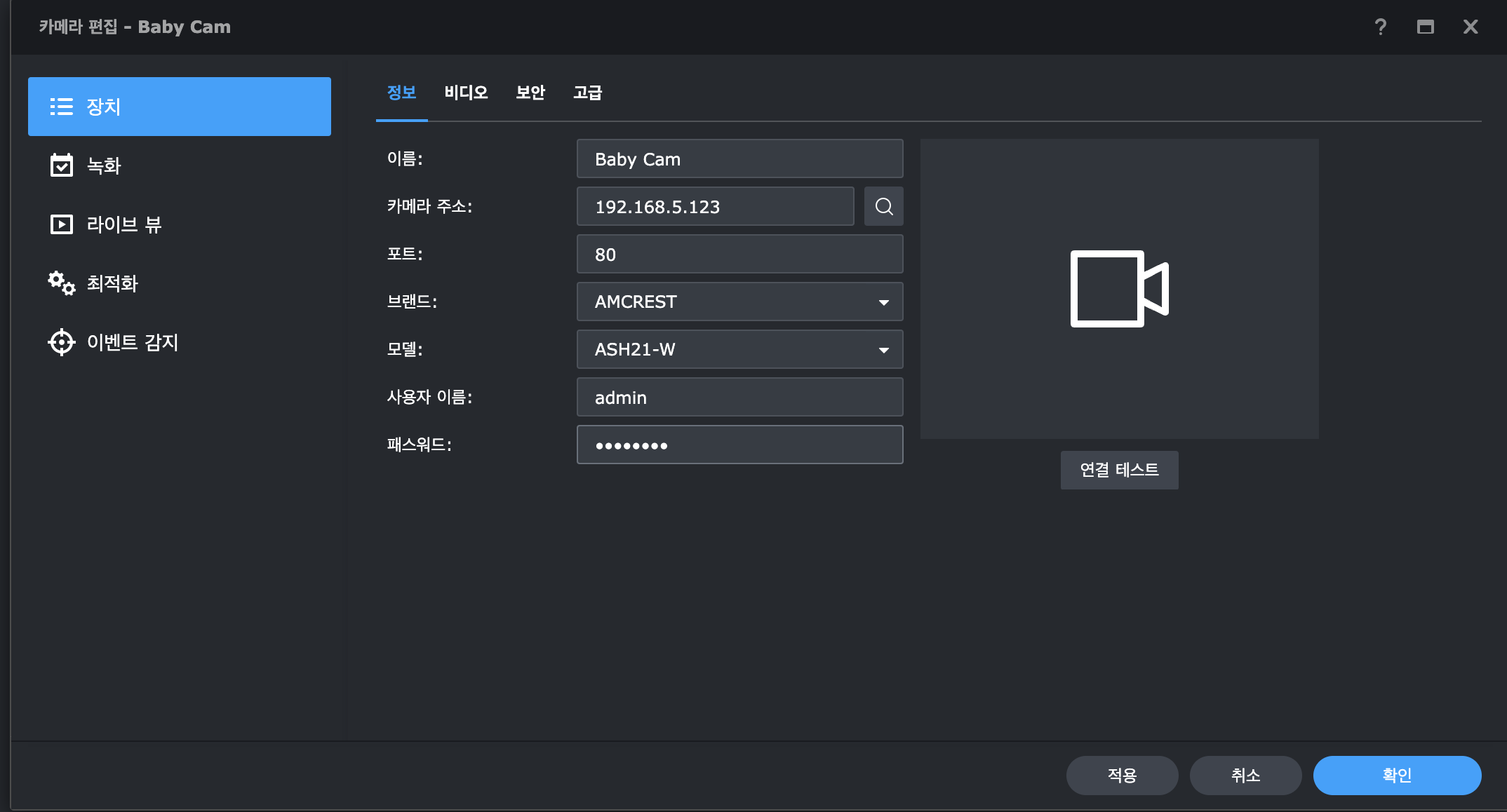 시놀로지나스를 구매 후 암크레스트와 연결하려고 하니 카메라 IP와 아이디 및 비밀번호를 알아야 한다고해서